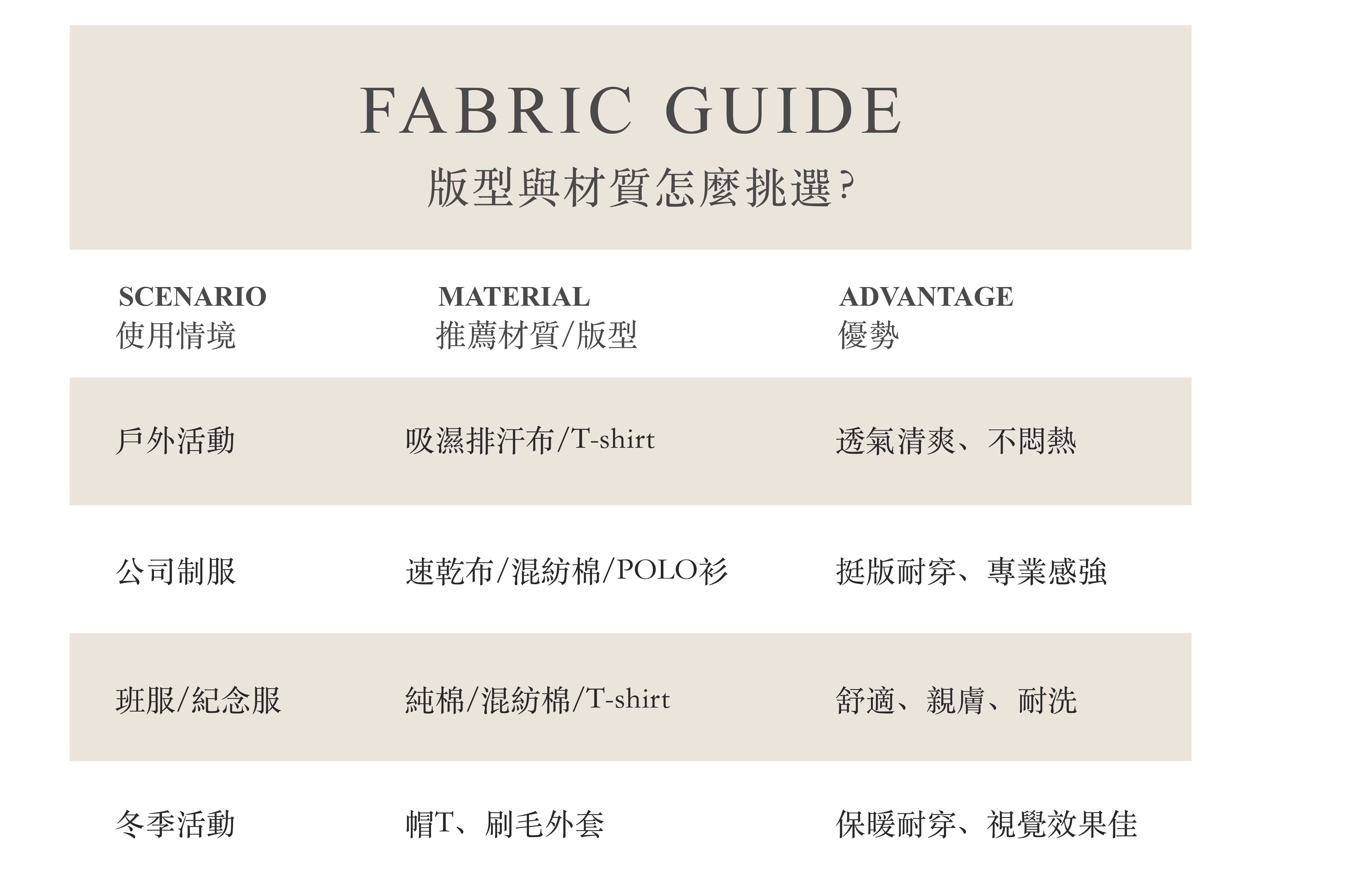 小提醒:若需長時間在室外活動,請優先選排汗布;若要展示品牌專業,首選 POLO 衫刺繡 LOGO。